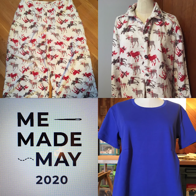 No, I didn't spill my morning coffee over my first outfit. A quick run to work followed by some errands meant that there is a change of clothes when I got home. These were the me-made items I wore and used today: Blue cotton sateen skirt circa 2018 (OOP Vogue 1247), cotton maple leaf face mask circa 2020 (Dhurata Davies face mask pattern), grocery shopping bags circa 2020 (OOP McCall's 4851), cotton striped wrapped shirtdress circa 2018 (Simplicity 8687), cotton flannel pajama top circa 2019 (Butterick 6296), cotton flannel pajama bottoms circa 2018 (OOP Vogue 9217).