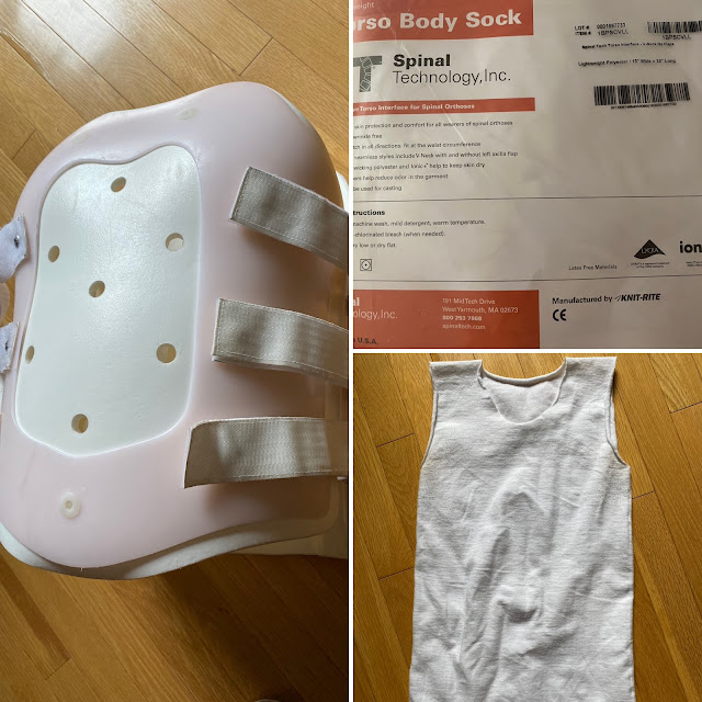 This is basically what I wear now. A sleeveless polyester body sock underneath the brace that causes abrasion wounds in the underarm region. I asked if the upper part of the brace could be cut down but the answer was no. And the family doctor suggests putting gauze bandages where the abrasion wound appear before I put the brace on. There has to be a simpler solution.